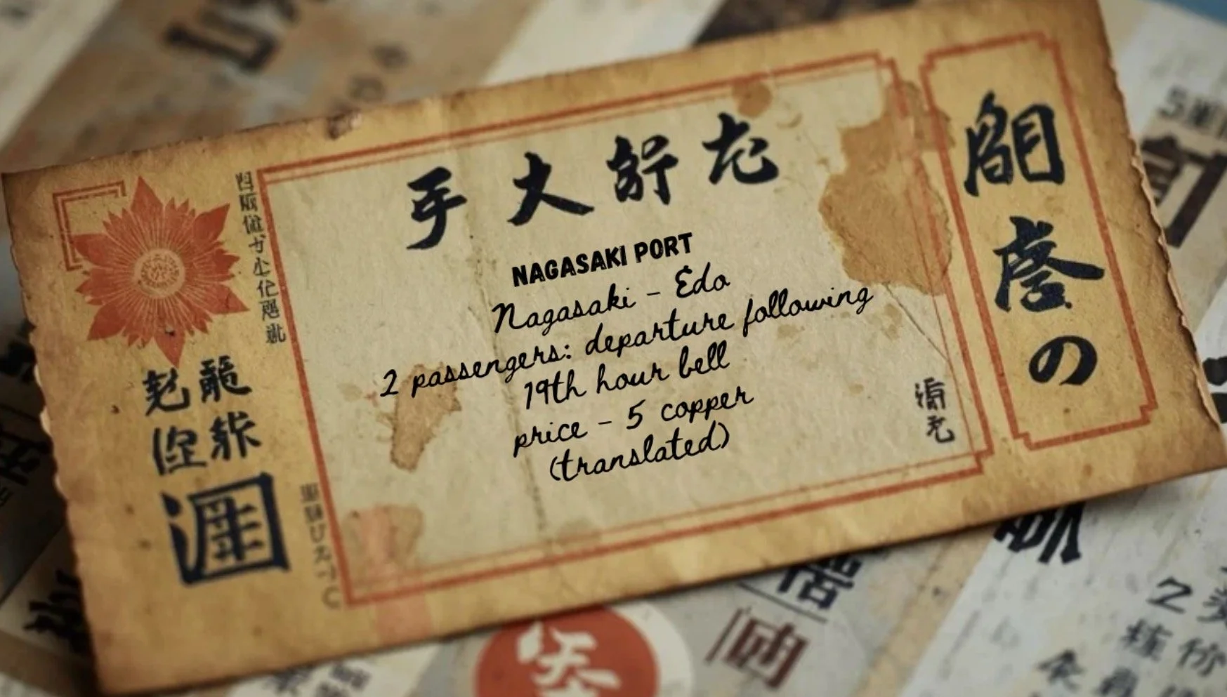 As we arrive at the port of Edo following two days of rough seas, unsanitary conditions and a diet of rice and pickled meats, I notice Mirio’s anxiety for our trial has escalated. He scribbles a phrase I can only decipher as poetic nonsense with a piece of charcoal he found in between the planks of the deck, desperate to express his thoughts I’m guessing. It does prove one thing, though: My ambition to live a better life far outweighs any thoughts of apprehension that Edo can throw into my head, but as I watch Mirio’s twitching hands and alarmed gaze fixed on the nearing shore, I realise sharp fear is shining through the sanguine boy I once knew.